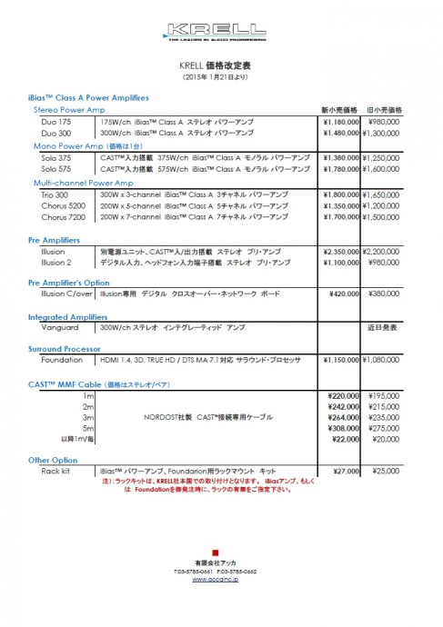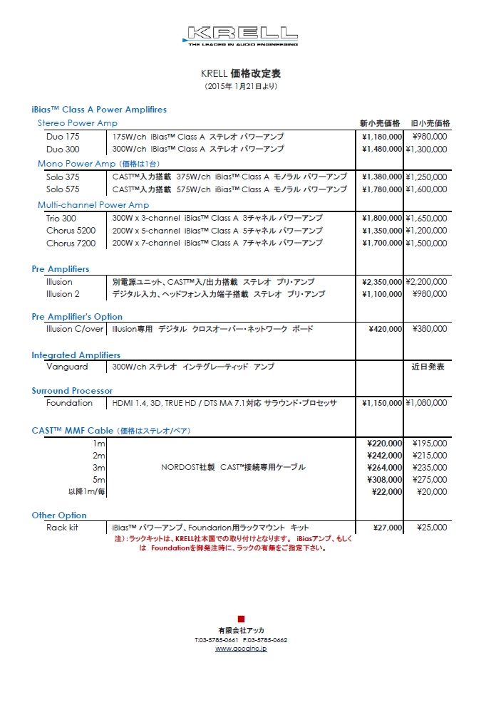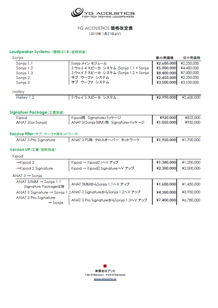 Krell、YG Acousticsの製品価格が2015年1月21日より改定されます。