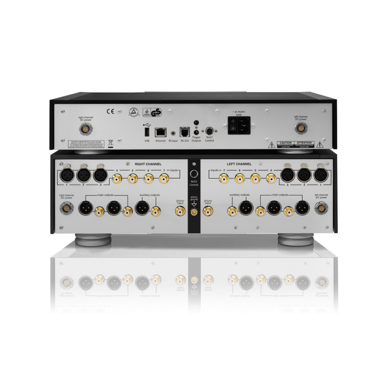 The Nº52 features seven analog inputs – three balanced XLR and four unbalanced RCA – as well as a dedicated phono input configurable for moving-magnet (MM) or moving-coil (MC) operation. Two sets of pre-outs are duplicated in both XLR and RCA jacks, while an additional auxiliary pair of XLR and RCA outputs is configurable, for fixed or variable output with independent source selection. This function allows the auxiliary output to function as a third pre-out, a pass-through full-range subwoofer output or a record output.