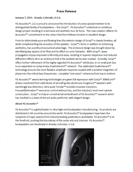 すでに日本では、世界に先駆けてインターナショナルオーディオショウでYG Acoustics Sonjaが公開されていますが、世界的にはCES2013にて正式発表される予定です。その「SONJA」のプレスリリースを少しフライング気味ですが公開します。