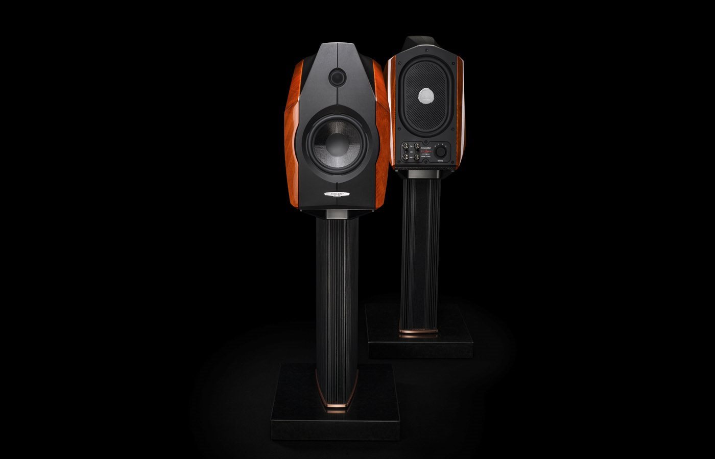 The carbon fiber sandwich “monocoque”, inspired by the supercar cockpits, is the main chassis structure on which the cabinet is build up. Constrained-mode damped lateral “Val di Fiemme” harmonic fir (Violin wood) sides, hand selected, quality graded and oriented for carefully optimized resonances control. The innovative resonance control of the wood structure is obtained by a 3D thickness distribution in the shape. “New Era” avional (from “the Sonus faber” experience) exo-squeleton front and rear clamp structure.