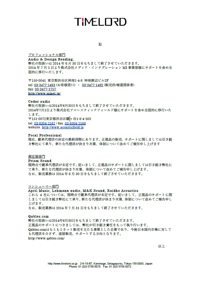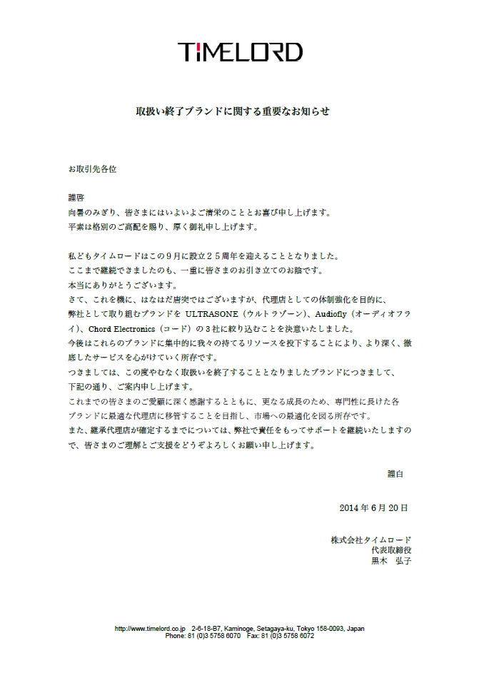 Timelord、取り扱いブランドを「 ULTRASONE 」「 Audiofly 」「 Chord Electronics 」の3社に絞り込み。April Music、Lehmann audio、 M&K Sound、 Raidho Acoustics、Focal Professional等の輸入代理から撤退へ。