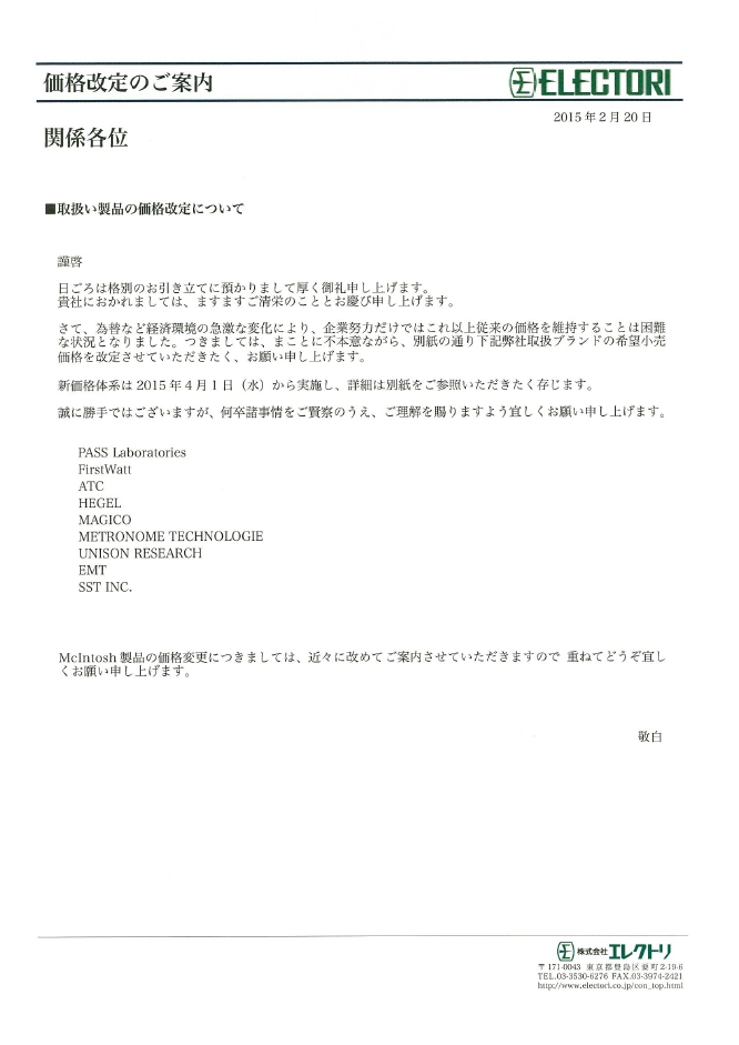 ELECTORI、製品価格を値上げへ。4月1日より。