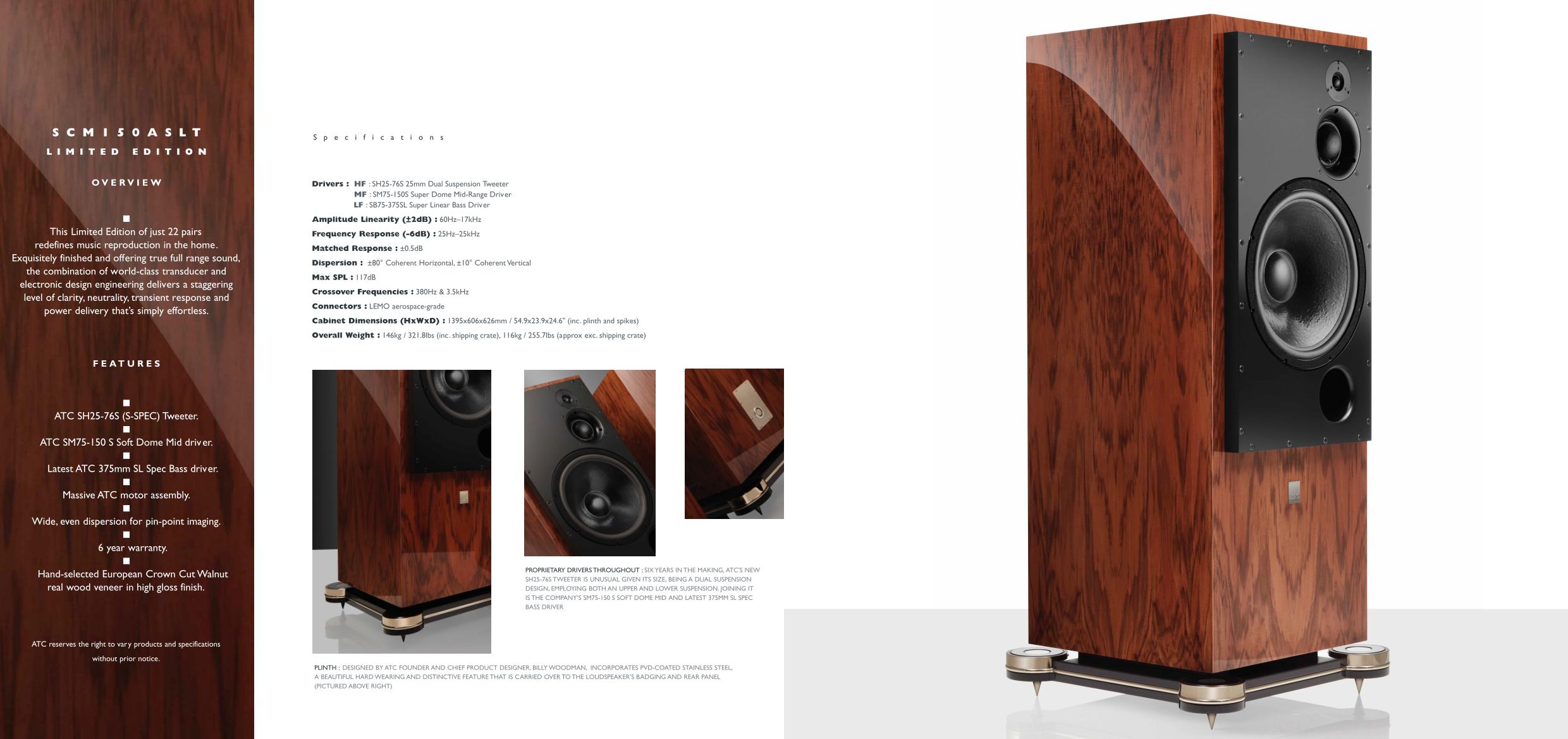 Manufactured to the highest standard by ATC’s own cabinet makers, weighing 116kg and at approximately 1.4m tall, each speaker enclosure is finished in selected European crown-cut walnut veneer with a high-gloss polyester lacquer, and detailed with a stainless steel badge, input panel and bespoke limited edition plinth, PVD treated to create an exclusive nickel-like appearance.