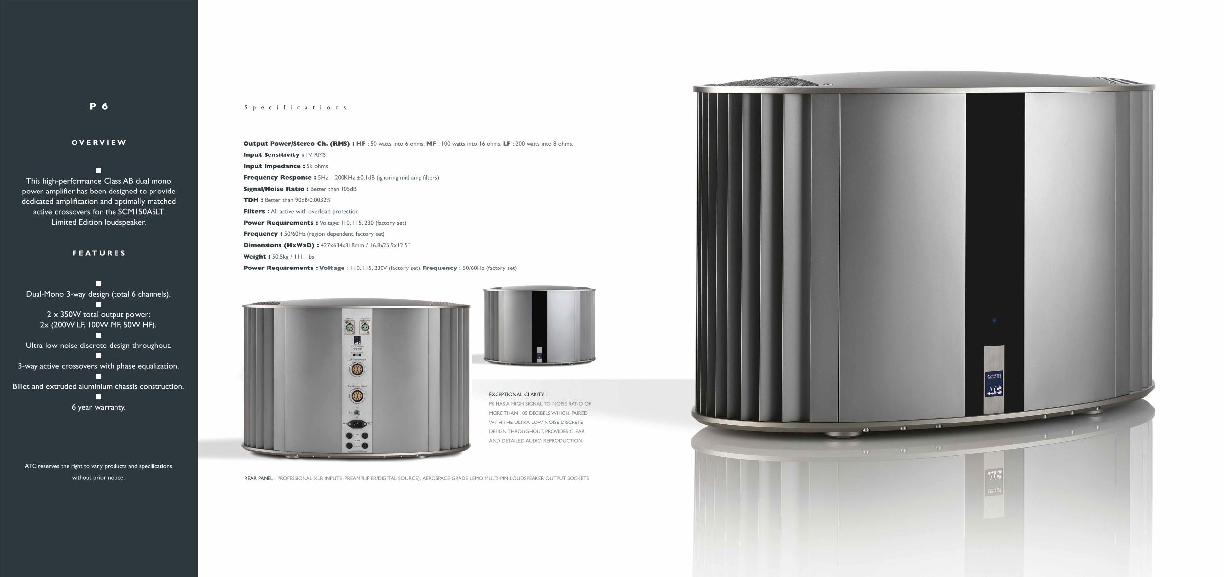 The P6 is a high-performance Class AB dual-mono power amplifier designed and built by ATC to provide dedicated amplification and optimally matched active crossovers for the SCM150ASLT. It features a total of 6 channels: 2x (200W LF, 100W MF, 50W HF) for a combined output power of 350W/side. Generating a signal-to-noise ratio of more than 105 decibels its ultra-low noise discrete design, paired with 3-way active crossovers with phase equalisation, offers clear and detailed audio reproduction. On the rear panel, professional L/R XLR inputs (from preamplifier/digital source) are joined by aerospace-grade LEMO multi-pin loudspeaker output connectors. Proprietary speaker cables are included with the system.