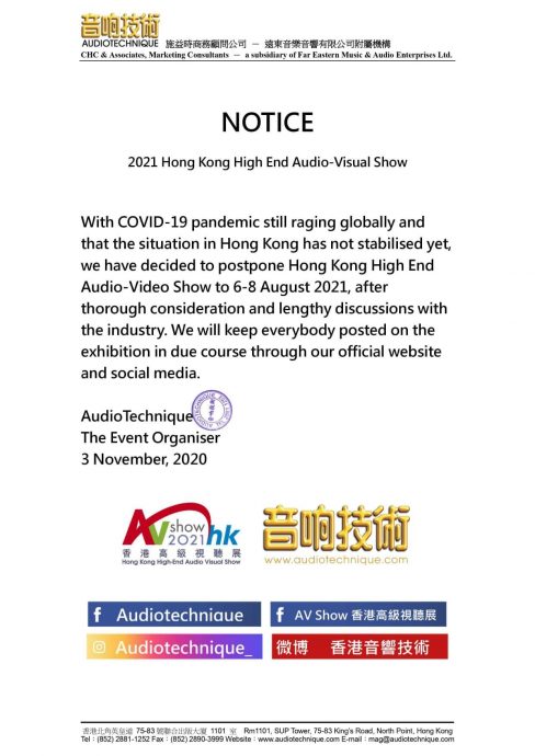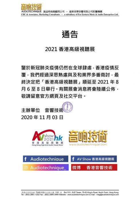 香港オーディオショウ、コロナウイルスにより延期していた2020年のショウを中止し2021年に