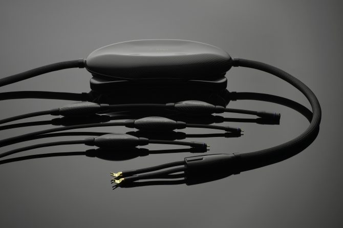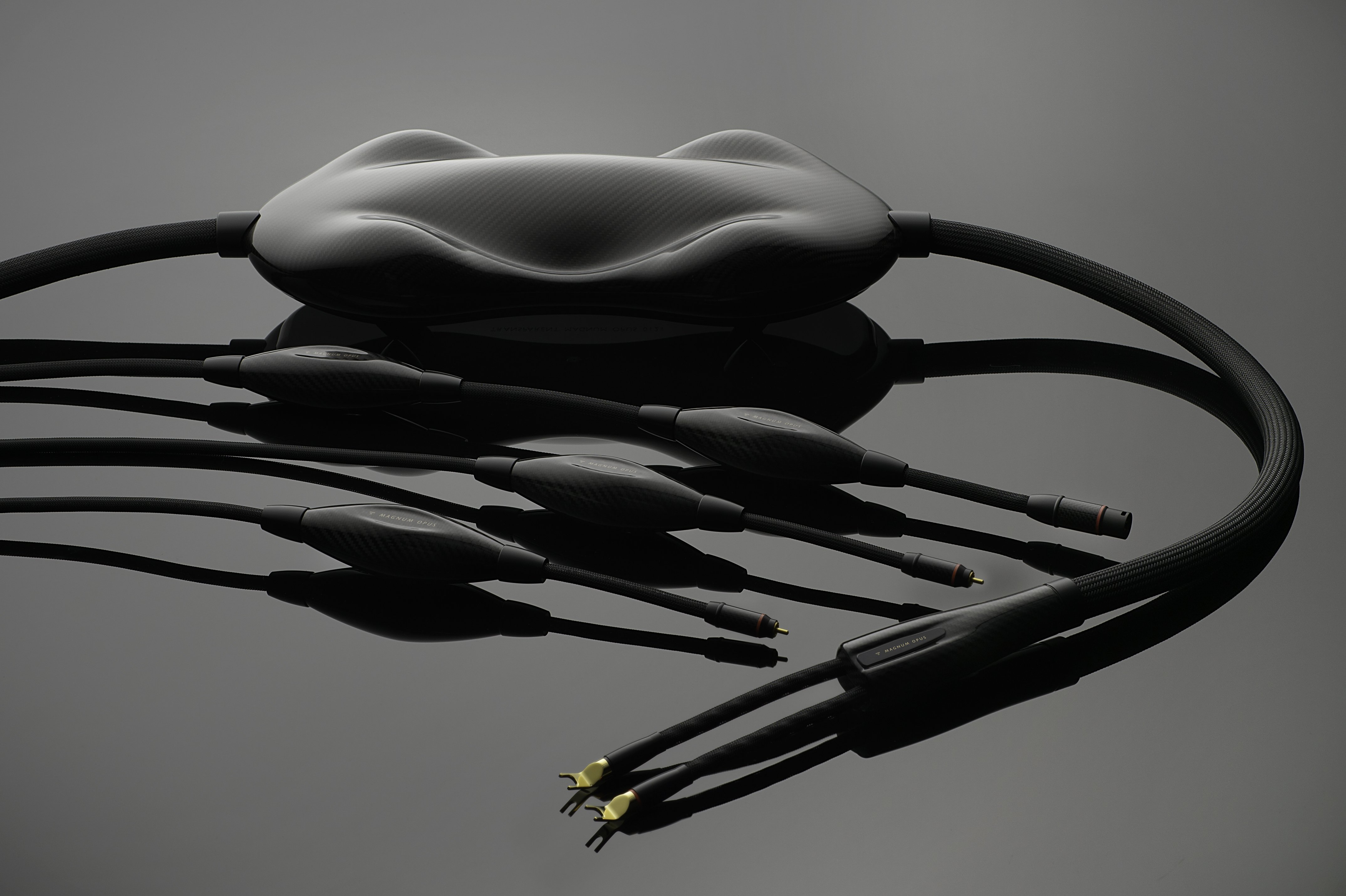 MAGNUM OPUS carbon fiber network housings have not changed, but the design team has gone to greater lengths to eliminate any vibration and resonance. Similar to the best mass-loaded speaker cabinets, Integrated Flexible Epoxy Resin (IFER) now fills every void. In addition, MAGNUM OPUS Speaker Cable has a newly configured, stiffer, heavier, more stable, vibration-nulling, polymethyl methacrylate (PMMA) plinth. A 3/16” carbon fiber plate embedded in a cavity filled with IFER stiffens the base and damps vibrations. This new stiff, resonant-free, platform marries solidly to its epoxy-loaded, carbon-fiber carapace with a thin thermoplastic, sound-damping layer. Fasteners bore deeply into the IFER mass in the carapace at a specific torque setting to solidify the whole construction.