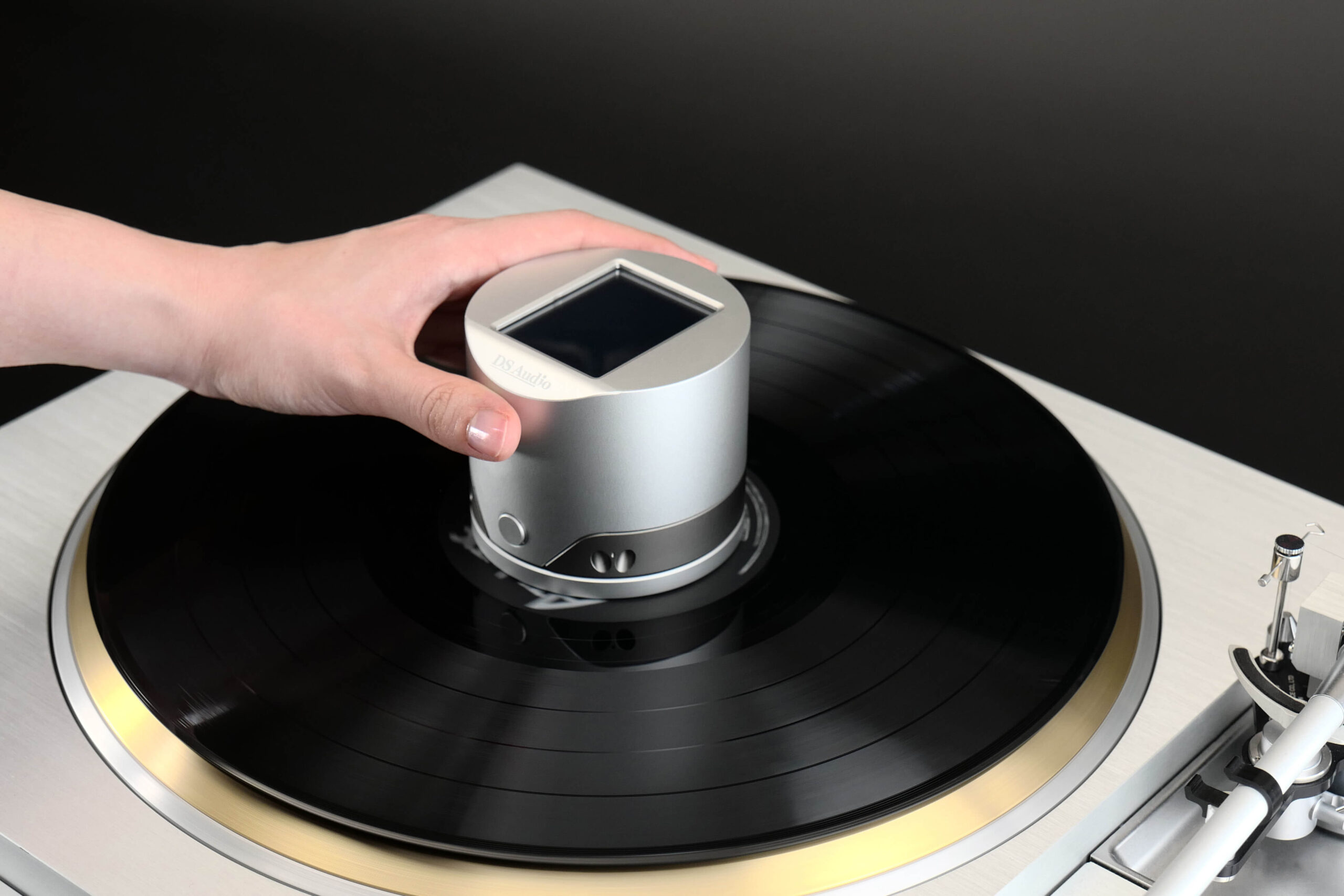 レコードプレーヤーを回転させた状態で、片手でスタビライザーの上部を抑えスタビライザーの回転を止めた状態にすると、スタビライザーが回転を検知し測定モードに移行します。