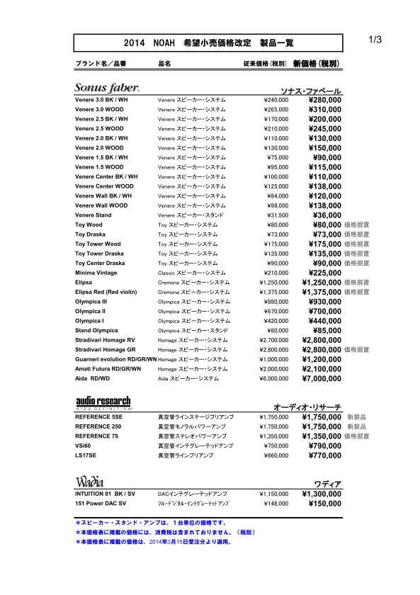 下記製品は本国での販売価格と輸出価格の改定、および各国通貨円安に伴い、2月1日より希望小売価格を改訂いたします。これまでの価格を維持すべく努力して参りましたが、昨今の急激な円安のため価格改訂を余儀なくされました。当社といたしましても海外および日本国内の内外価格差を出来るだけ少なくするため、今回の値上げにつきましても極力押さえるよう努力した結果とお考えいただければ幸いでございます。尚、1月31日までのご注文分に関しましては現行価格にて承ります。