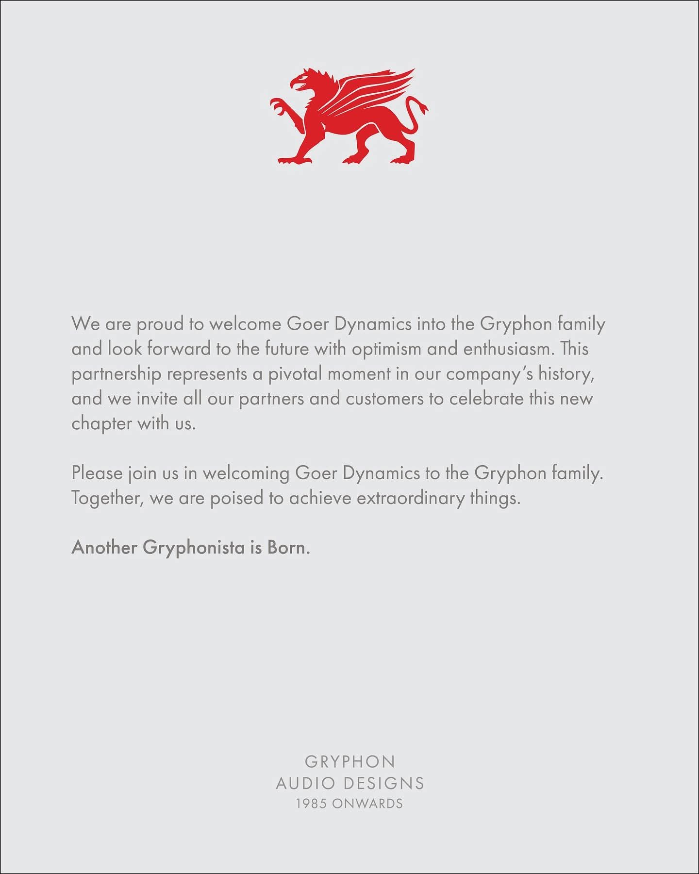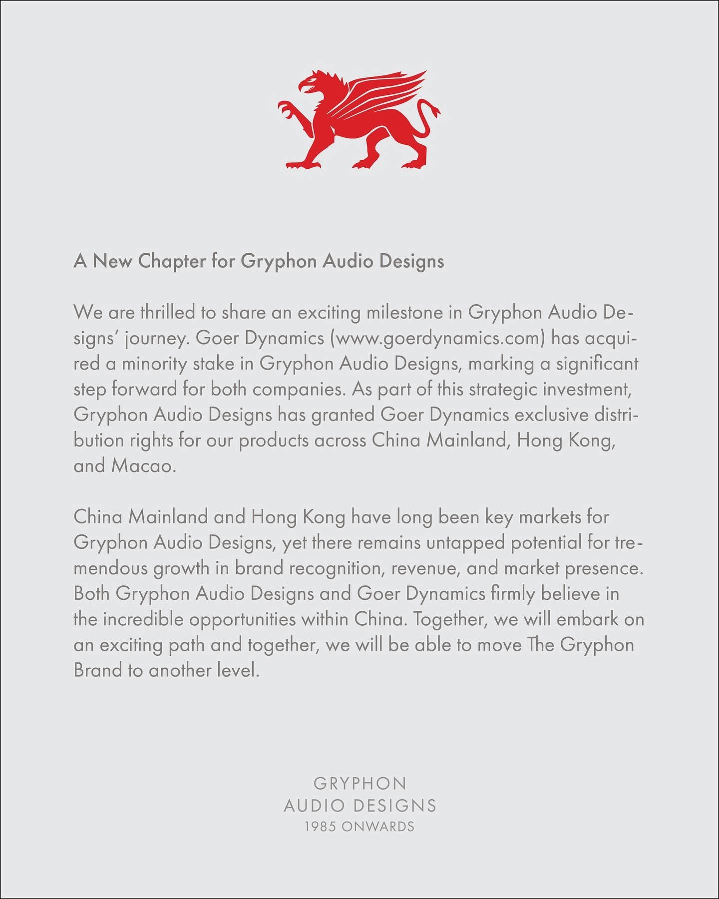 We are thrilled to share an exciting milestone in Gryphon Audio De-signs’ journey. Goer Dynamics (www.goerdynamics.com) has acqui-red a minority stake in Gryphon Audio Designs, marking a significantstep forward for both companies. As part of this strategic investment,Gryphon Audio Designs has granted Goer Dynamics exclusive distri-bution rights for our products across China Mainland, Hong Kong,and Macao.