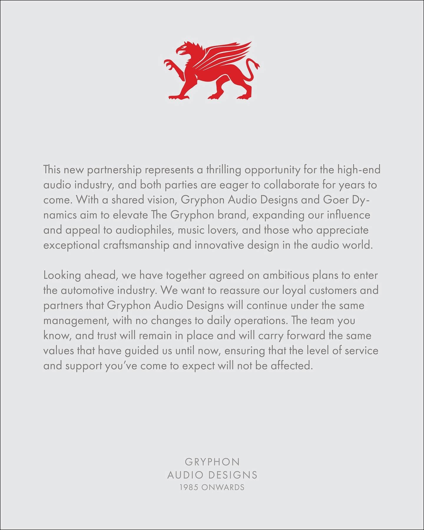Looking ahead, we have together agreed on ambitious plans to enterthe automotive industry. We want to reassure our loyal customers andpartners that Gryphon Audio Designs will continue under the samemanagement, with no changes to daily operations. The team youknow,and trust will remain in place and will carry forward the samevalues that have guided us until now, ensuring that the level of serviceand support you’ve come to expect will not be affected.