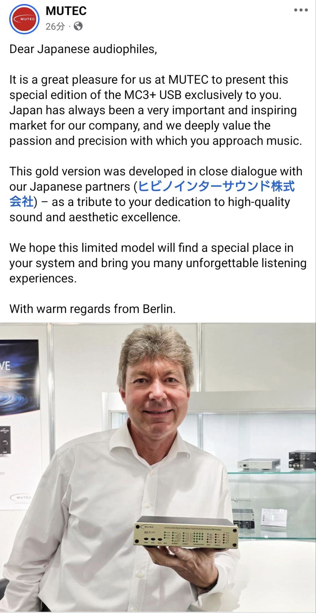 MUTECは、MC3+ USBの特別限定版を皆様にお届けできることを大変嬉しく思います。日本は当社にとって常に非常に重要で刺激的な市場であり、皆様が音楽に向き合う情熱と緻密な姿勢を深く評価しています。