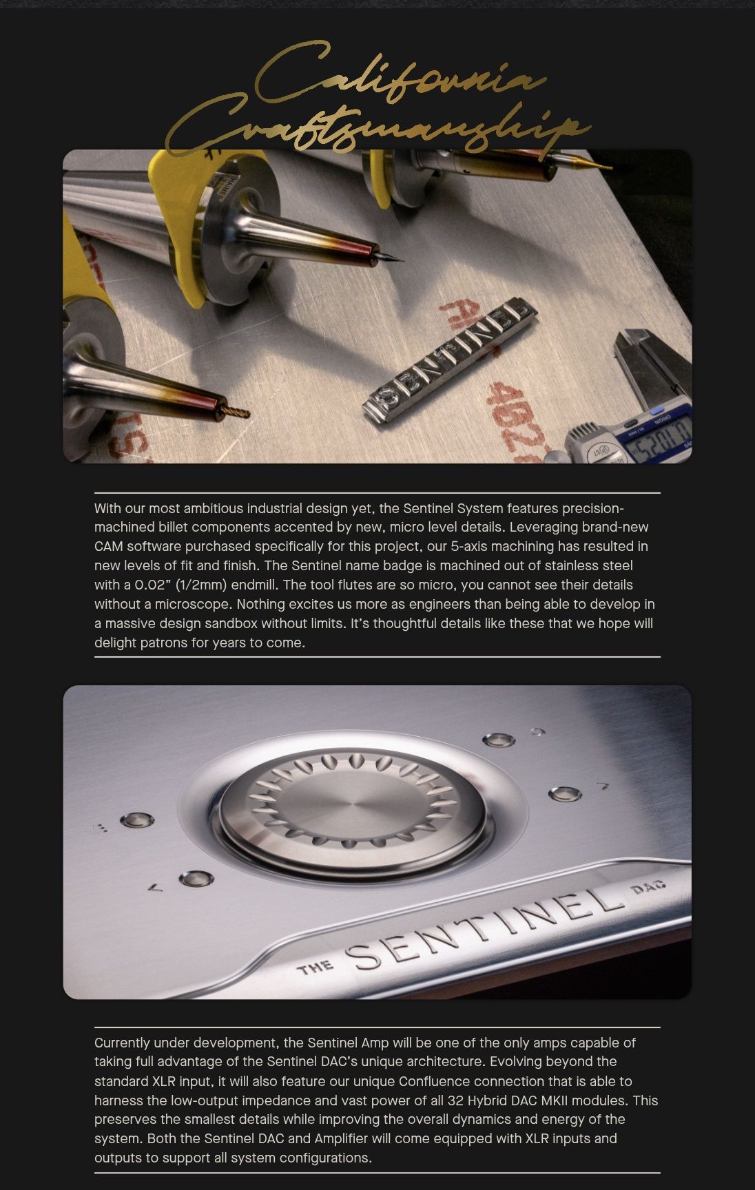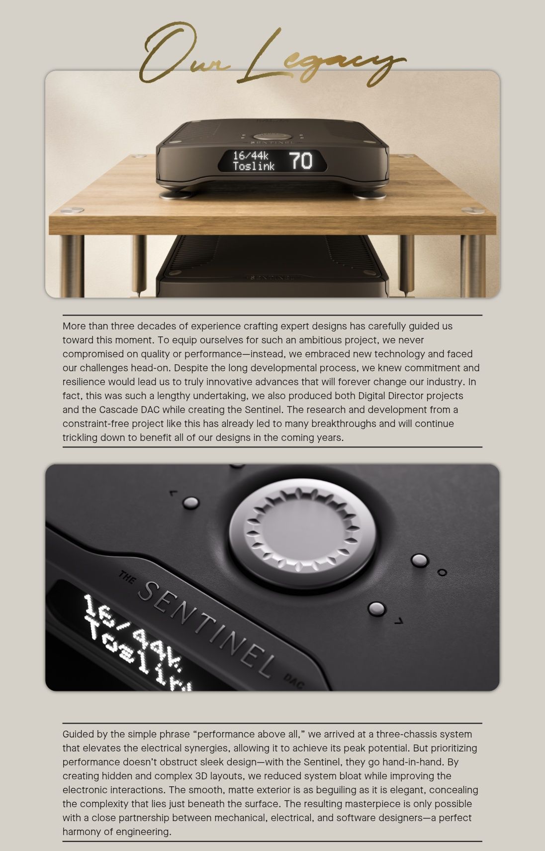More than three decades of experience crafting expert designs has carefully guided us toward this moment. To equip ourselves for such an ambitious project, we never compromised on quality or performance—instead, we embraced new technology and faced our challenges head-on. Despite the long developmental process, we knew commitment and resilience would lead us to truly innovative advances that will forever change our industry. In fact, this was such a lengthy undertaking, we also produced both Digital Director projects and the Cascade DAC while creating the Sentinel. The research and development from a constraint-free project like this has already led to many breakthroughs and will continue trickling down to benefit all of our designs in the coming years.