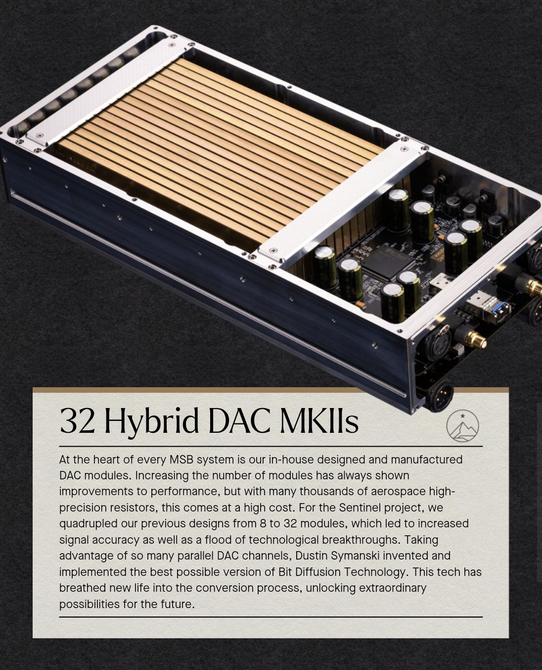 At the heart of every MSB system is our in-house designed and manufactured DAC modules. Increasing the number of modules has always shown improvements to performance, but with many thousands of aerospace high-precision resistors, this comes at a high cost. For the Sentinel project, we quadrupled our previous designs from 8 to 32 modules, which led to increased signal accuracy as well as a flood of technological breakthroughs. Taking advantage of so many parallel DAC channels, Dustin Symanski invented and implemented the best possible version of Bit Diffusion Technology. This tech has breathed new life into the conversion process, unlocking extraordinary possibilities for the future