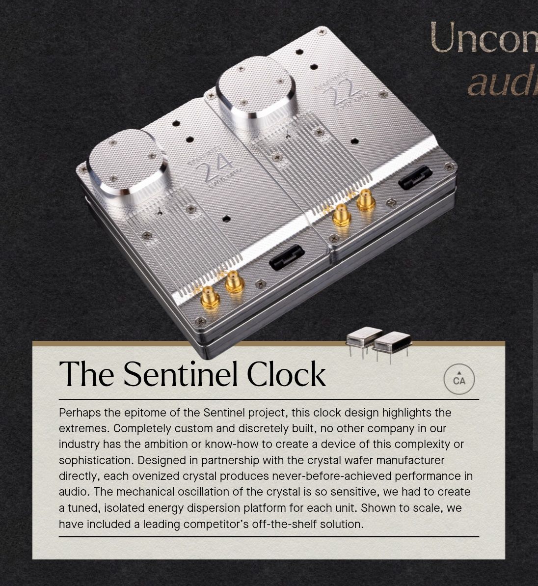 Perhaps the epitome of the Sentinel project, this clock design highlights the extremes. Completely custom and discretely built, no other company in our industry has the ambition or know-how to create a device of this complexity or sophistication. Designed in partnership with the crystal wafer manufacturer directly, each ovenized crystal produces never-before-achieved performance in audio. The mechanical oscillation of the crystal is so sensitive, we had to create a tuned, isolated energy dispersion platform for each unit. Shown to scale, we have included a leading competitor’s off-the-shelf solution.