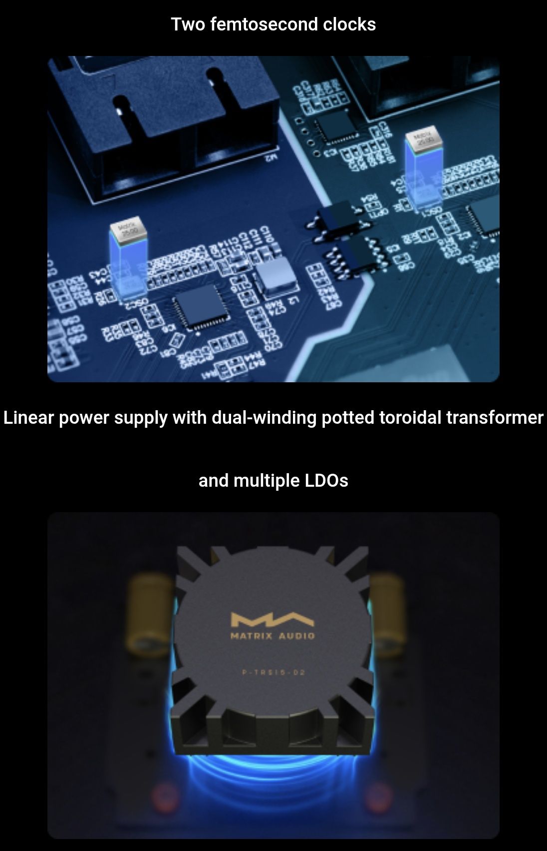 Dual-winding epoxy – potted toroidal transformer with multiple LDO linear power supplies.